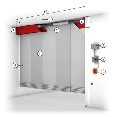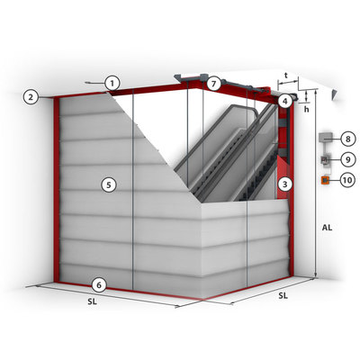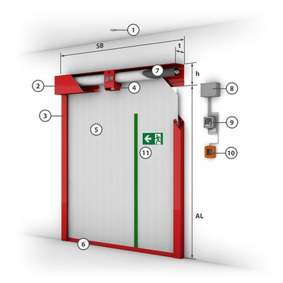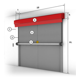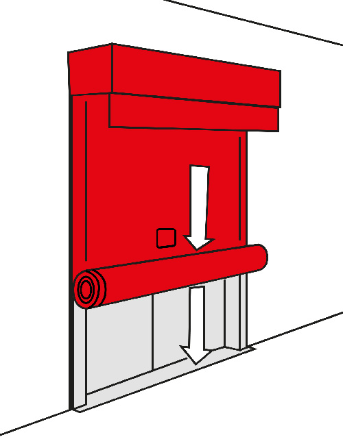 Prefabricated individual modules are lined up as a unit to form a complete smoke apron up to any lengthStandardised drop lengths up to 7 m Designed for the time class and temperature loads D = 600 °C As standard with "Gravigen" drive system i.e. closing without external energy, fire-resistant cables are not necessaryRobust drive systems, suitable for a high number of cycles up to 1,000 cycles with approved locking devices Modular mounting of the winding casings on top of or next to each otherConnected closing strip across all modules Also suitable (approved) for use as a floor-closing smoke apron and with lateral guide rail option.