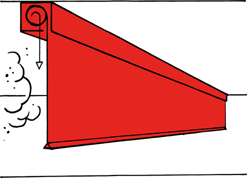 Supercoil is outstanding for its flexibility in the implementation of made-to-measure solutions. The smoke apron consists of one web part up to 50 m in width and features a drop length of 9.5 m. It is designed for high time classes at temperature loads up to 600 0C (D) and 1,100°C (ETK curve - DH). If guide rails are used, the smoke apron ensures that zero smoke escapes over the entire width of the apron. Thanks to the 'Gravigen' drive motor the apron closes without external energy. Supercoil is also suitable as a floor-closing and partition-forming smoke apron and can be equipped with an opening that allows persons to pass. Furthermore, the clever design allows for a combination with the passable Stripecoil smoke apron.